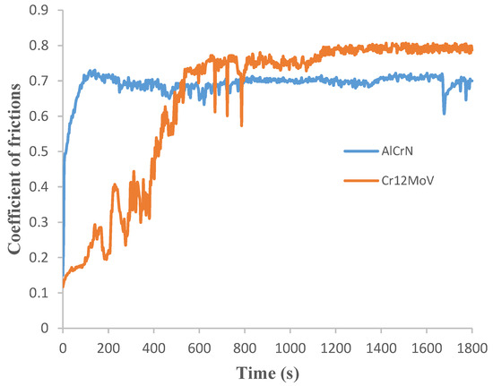 In order to evaluate the tribological properties and analyze the tribological behavior of AlCrN coatings, this study obtained the coefficient of friction (COF) curves for both the substrate and coatings through friction and wear experiments, as illustrated in Figure 9. As shown in the figure, the friction process for both the uncoated substrate specimen and the coated specimen can be divided into an initial grinding period followed by a stabilization period of wear. During the initial stage of wear, the coating’s coefficient of friction exhibited a rapid increase from 0 to 100 s, reaching a value of 0.7. This was followed by a further increase between 100 and 150 s, peaking at a maximum value of 0.72 before experiencing a slight decrease; thereafter, fluctuations in COF were significant during the interval from 150 to 800 s, after which it stabilized around approximately 0.7. In [27], AlCrN coating exhibited a similar friction coefficient of 0.65. Similarly, during the first phase (0–150 s), there was an upward trend observed in the friction coefficient for the uncoated Cr12MoV substrate as well; during subsequent testing from 150 to 800 s, its COF values fluctuated but generally trended upwards, reaching about 0.75 before slightly decreasing again to maintain relative stability with values around approximately 0.8 during its stabilization period. The disparity between the coefficients of friction for coated specimens versus those for substrates was attributed to their conditions prior to conducting friction wear experiments. The uncoated Cr12MoV specimen underwent polishing that resulted in an exceptionally smooth surface; consequently, upon initiation of abrasion testing, this surface deteriorated rapidly, leading to substantial fluctuations in COF during early wear stages. In contrast, since no polishing was performed on AlCrN-coated specimens—coupled with sedimentary particles present on their surfaces—the initial wear experienced was significantly intense, resulting in a swift rise in COF within a short timeframe. At stable wear stages following these events, only minor changes were noted regarding fluctuations.