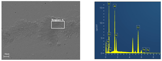 According to the energy spectrum analysis of the wear marks in Region A, as shown in Figure 10, the presence of oxygen and iron elements was detected, indicating that the coating was subject to both oxidative wear and abrasive wear. The detection of carbon (C) and silicon (Si) elements suggests the occurrence of adhesive wear. Additionally, the high content of aluminum (Al) and chromium (Cr) played a significant role in enhancing the wear resistance of the coating.