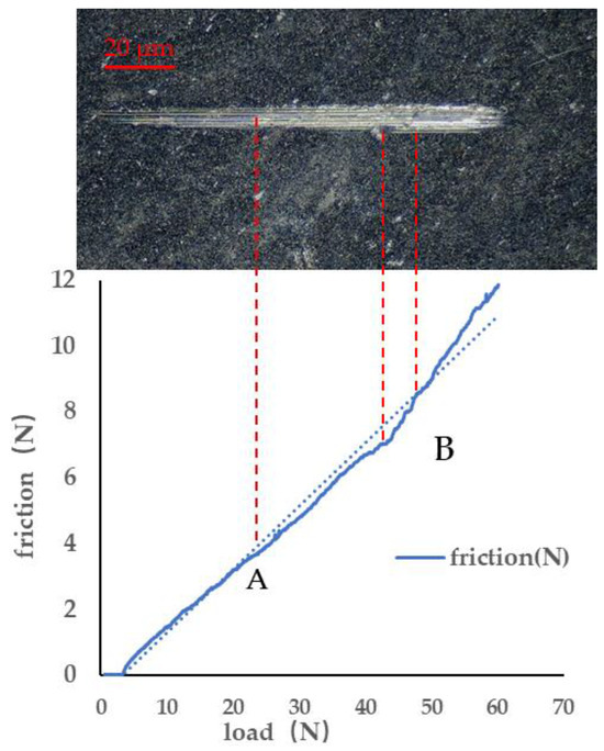 The coating adhesion was evaluated and analyzed based on the dimensions of the scratches, including length, width, and depth, as well as the extent of coating delamination and cracking. The film–substrate adhesion was characterized by a critical load at which there was a sudden change in the friction force. Figure 11 and Figure 12 show the load–friction force curves of the AlCrN-coated specimens tested during the scratch experiments and the surface morphology after the scratch tests, respectively. As illustrated in Figure 12, as the probe indenter made contact with the film coating and moved forward, friction developed on the coating’s surface. Along the scratch path, the friction force increased with the applied load, while the scratch width and depth also progressively increased. Significant flaking occurred on both sides of the scratch until the coating eventually failed. Combined with the scratch morphology and the friction–load curve, it can be observed that at point A (as shown in Figure 11), cracking initiated at the scratch edge, indicating the onset of coating failure; at point B, the coating started to peel off, signifying complete failure. At this stage, the load reached the critical value, and the adhesion strength of the coating was about 48 N. The adhesion strength of the coating to the substrate was reported in [24] to be around 15 N when coated with different Al/(Al + Cr) ratios of 0.66, 0.47, and 0.46. In contrast, the adhesion strength of Al50Cr50 and Al60Cr40 coatings to SDSS steel substrate was reported in [22] to be approximately 90 N. This indicates that the adhesion strength between AlCrN coatings and the substrate is significantly influenced by both the characteristics of the substrate material and the deposition process used.