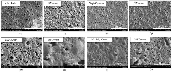 Surface morphology of PEO coating: (a) NaF 4 min PEO deposit; (b) NaF 30 min PEO deposit; (c) LiF 4 min PEO deposit; (d) LiF 30 min PEO deposit; (e) Na2SiF6 4 min PEO deposit; (f) Na2SiF6 30 min PEO deposit; (g) WF 4 min PEO deposit; (h) WF 30 min PEO deposit.