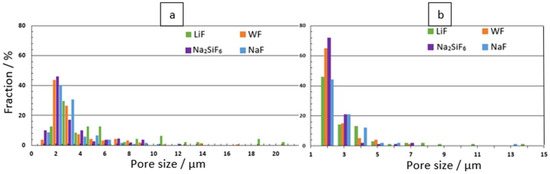 Figure 2 shows the pore size distribution for each substrate at the 4 min and 30 min deposition times. Figure 2a shows that the morphology of the coating at the 4 min deposition time in the LiF bath is significantly different from the other electrolytes. The average pore size for LiF samples is 4.53 μm. The largest pore size for LiF samples is 18 μm, compared to 15 μm for WF samples. The average pore sizes for the other samples range from 2.50 to 2.92 μm (Table 2). Figure 2b shows that pore size is mainly distributed between 0.5 μm and 1.5 μm for each electrolyte. However, LiF samples can reach pore sizes up to 13 μm.