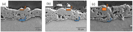 A more comprehensive study was made of the samples with a 30 min deposit time. Local analyses between the outer and the inner layers were performed to study the mass percentage of the various elements and, above all, to verify the presence of fluorides in the layer (see Table 5, Figure 4). For each fluorinated sample, the atomic percentage composition is higher for fluorine at the coating/substrate interface than in the outer layer. This proves that fluorides have a greater impact on the barrier layer. In the case of Na2SiF6, analyses show that despite the presence of silicon in the SiF62− ion, no more silicon can be detected at the interface. It is noteworthy that at the surface of the PEO layer with a 30 min deposition time for LiF, no fluoride is present for lithium salt. This is of significant importance from a biomedical perspective, as fluoride intake must be limited in the body [26].