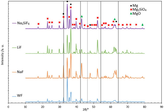 XRD was also performed to identify the crystalline structure obtained for each investigated condition and the appearance of MgF2 peaks also mentioned in some articles [27]. XRD was only studied for the samples obtained after 30 min of the process, as the PEO layer thickness was very thin (6 microns) after 4 min and did not allow the detection of any phase other than the substrate. As can be seen in the amount of F in the 4 min deposit, in all cases it is around 3 wt.% (Table 4), which is too low to be detected by XRD, as this technique has a detection limit of around 5 wt.%. The 30 min deposit coatings were analysed. The coatings are mainly composed of magnesium silicate and magnesium oxide (Figure 5). However, the crystalline MgF2 phase expected for fluoride samples was not detected. The 2θ values for MgF2 were located at 42.23° and 54.20° (as shown by the black lines in Figure 5). Two hypotheses can therefore be established: the crystalline MgF2 phase is not present, or it is present, but quantities are too small to be detected. Comparing the graphs together, the peaks are in the same positions for each sample. However, the peak intensities representing Mg2SiO4 are proportionally higher than for MgO in the fluoride-containing samples. For the LiF sample, the peaks representing MgO are less intense, which may explain why this phase is present in smaller quantities. The literature shows that to form MgO, it is necessary to attain a high temperature (104 K) [23]. From the SEM images we learned that more localised intense discharges appeared to have formed on the LiF sample during the PEO process. As a result, the temperature may have been inhomogeneous over the sample and less MgO crystalline phase was formed.