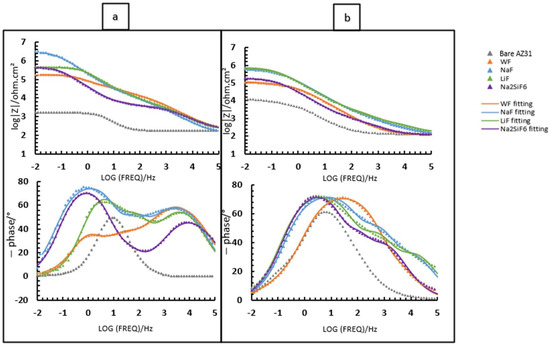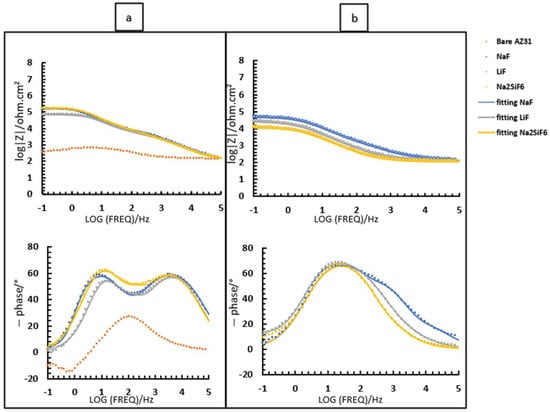 Bode diagram of fluoride and non-fluoride samples after 30 min PEO deposit: (a) 24 h immersion in NaCl 0.1 M saturated in Mg(OH)2; (b) 24 h immersion in PBS.