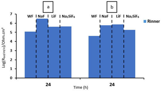First, when comparing the coatings with and without fluorine, it is generally observed that all resistance values are lower for the sample without fluorine compared to the samples with fluorine (Table 6). This suggests that the addition of fluoride significantly impacts the strength of the oxide layer, potentially due to the formation of MgF2 in the barrier layer, as previously discussed in other studies. Then, it can be observed that, in general, the Rinner of all coatings is higher than Router, suggesting that the barrier layer for all coatings is responsible for the system’s protection. This could mainly be due to the formation of MgF2, as mentioned above, and the presence of high external and intermediate porosity in all coatings (Figure 3a,c,e,g) [29]. This porosity facilitates the entry of corrosive species from the medium, causing permeation and degradation of the PEO layer, thus resulting in reduced resistance values in these two parts. This is consistent with the high CPEouter values and n values around 0.7–0.8, suggesting porous and inhomogeneous coatings [24]. Comparing the fluorine-containing coatings after 2 and 24 h of immersion, it can be observed that the Rinner value (as it is responsible for the system’s protection) results in the following protection ranking (see Figure 8): NaF > Na2SiF6 > LiF. This could be attributed to the higher thickness and compactness of the barrier layer observed in Figure 3a compared to the other coatings. The resistance values decrease with the immersion time. This is mainly due to the pores in the PEO layers, which allow corrosive species to easily access the substrate. As a result, the barrier layer is directly impacted by Cl− ions. The aggressive solution penetrates through the pores of the PEO layer, degrades the layer and reaches the barrier layer [30].