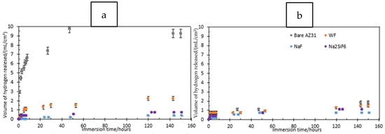 The volume of gas released during eudiometry tests offers insights into sample corrosion. These tests were conducted on three types of magnesium: bare magnesium, coated magnesium without fluorides, and coated magnesium with the two most effective fluorides from the impedance measurements—NaF and Na2SiF6. Figure 13 illustrates how the volume of hydrogen released changes over time during immersion in either 0.1 M NaCl or PBS. In Mg(OH)2-saturated 0.1 M NaCl (Figure 13a), bare Mg is the sample that releases the most H2. This is perfectly consistent with the fact that it has no coating to protect the substrate. The WF sample (without fluorides) also releases more H2 than NaF and Na2SiF6, demonstrating the impact of fluorides on the PEO layer. For the two samples with fluorides, the release of hydrogen is quite similar. Indeed, the presence of MgF2 at the substrate/coating interface produces a barrier layer which increases the corrosion resistance of the PEO coating [30]. Moreover, the corrosion rate is below 0.5 mm/year for the fluorinated samples while it is 1.41 for the WF sample and 5.86 for the bare magnesium (Table 10). Figure 14a,b show that after 6 days of immersion, the bare AZ31 surface is covered by corrosion product: Mg(OH)2 (see Figure 15). However, with a layer of PEO, the surface has almost none left. However, some articles explain that the corrosion product can be located between the PEO layer and the substrate itself or in the pores of the latter. This can also block the passage of hydrogen bubbles [37].