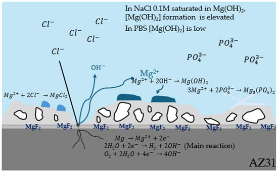 - Prince, L.; Noirfalise, X.; Paint, Y.; Olivier, M. Corrosion Mechanisms of AZ31 Magnesium Alloy: Importance of Starting PH and Its Evolution. Mater. Corros. 2022, 3, 1615–1630. [Google Scholar] [CrossRef]