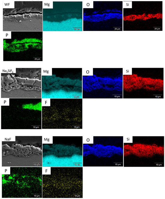 As shown in Figure 14, crystals form on the surface of the samples. Bare AZ31 has a much larger crystal distribution than PEO layers. However, fluoride-free coating (Figure 14c,d) has more crystals on its surface than fluoride-containing coatings. This is due to the Mg2+ released during corrosion, which precipitates with the phosphate (shown Figure 15). The more phosphate crystals there are, the more corroded the sample [38]. Furthermore, Figure 16 shows the distribution of phosphate in the cross-section showing that the phosphates are located where the electrolyte can pass through. This means that H2 bubbles are blocked not only by the PEO layer, but also by the phosphate crystals.