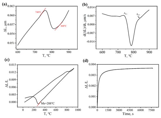 The phase-transformation points Ac1 and Ac3 were measured using a DIL 402 dilatometer (Netzsch, Germany) under controlled heating conditions (5 °C/min). Figure 1a shows the original dilatation curve during continuous heating, and Figure 1b shows the first derivative curve, i.e., d(ΔL)/dt-T curve, which better reflects the changes in dilatation. The phase-transformation points Ac1 and Ac3 were determined to be 740 °C and 840 °C, respectively.