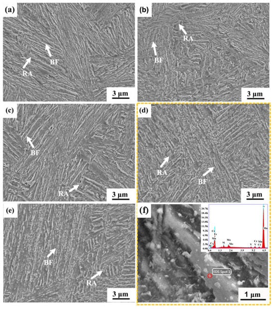 Figure 2 presents the SEM images of samples tempered at various temperatures. No martensitic structure was observed in any of the tempered samples, indicating that no martensitic transformation occurred during air cooling after tempering. The microstructure of the untempered sample (Figure 2a) comprised bainitic ferrite (BF) and RA, with no carbides detected. At 350 °C and 450 °C (Figure 2b,c), the retained austenite began to decompose, and carbides started to precipitate. At 550 °C and 600 °C (Figure 2d,e), the BF laths fragmented, and their boundaries became indistinct. The characteristic bainitic structure gradually disappeared, and a significant amount of fine granular carbides precipitated and coarsened. Within the tempering temperature range of 350–600 °C, the microstructural evolution involved the progressive decomposition of RA and BF, accompanied by the precipitation and coarsening of carbides as the tempering temperature increased. In addition, Figure 2f shows the EDS analysis of the 550 °C-tempered sample. A large number of carbides were observed, and point analysis confirmed the presence of V-containing particles at the nanoscale.