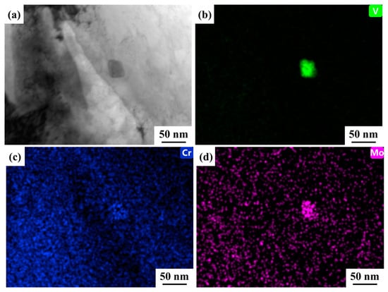 EDS mapping of the 450 °C-tempered sample: (a) HAADF image; (b) V-Kα; (c) Cr-Kα; (d) Mo-Kα.