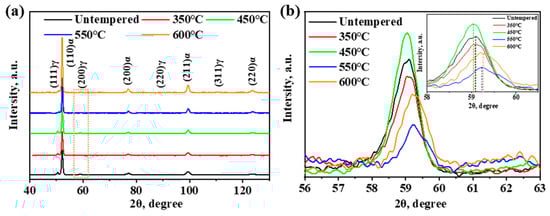 Figure 5a shows the XRD patterns of samples tempered at different temperatures. The content of RA was calculated using Equations (2) and (3), as shown in Table 1. At lower tempering temperatures, the content of RA changed little, as carbon atoms in BF continued to diffuse into RA, enhancing its thermal stability. At higher tempering temperatures, the RA content decreased significantly due to the carbides precipitation, which consumed carbon in the RA, reducing its thermal stability and leading to its decomposition into cementite and ferrite. Figure 5b exhibits the (200)γ peak of austenite, with an inset showing an enlarged view. The (200)γ peak shifted to the left at 350 °C and 450 °C, indicating an increase in carbon content and stability of RA. At 550 °C and 600 °C, the (200)γ peak shifted to the right, indicating a decrease in carbon content and stability of RA.