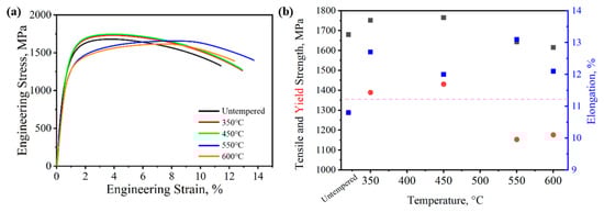 (a) Engineering stress–strain curves; (b) relationship between mechanical property parameters and tempering temperature. Note: In Figure 6b, the black frame, blue frame, and red circle represent tensile strength, yield strength, and elongation, respectively.