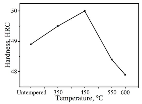 Figure 7 shows the Rockwell hardness of samples tempered at different temperatures. The hardness of untempered sample increased gradually up to 450 °C, reaching a maximum HRC of 50. At higher tempering temperatures, the hardness decreased significantly, with the lowest hardness of HRC 47.9 observed at 600 °C. The increase in hardness at 350–450 °C was primarily due to the precipitation of V-containing particles, which contributed to second-phase strengthening. At 550 °C, owing to the decomposition of filmy and blocky RA, the hardness decreased significantly, forming a mixture of cementite and ferrite, which reduced the mechanical stability of RA. Additionally, the dislocation density in BF decreased with increasing tempering temperature, further reducing hardness.