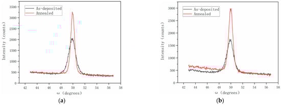 The following parameters were employed for high-temperature annealing of the AlN buffer layer: temperature of 1550 °C, annealing duration of 1 h, vacuum level of 2 × 10−3 Pa, using a vertical annealing furnace. Due to the melting point of Si substrates (1414 °C) being incompatible with these annealing conditions, the process was exclusively applied to AlN on sapphire substrates. Figure 1 compares the XRD measurement results of the AlN buffer layer before and after annealing. A visual inspection of the curve profiles reveals that high-temperature annealing under optimal conditions significantly improves the crystalline quality of AlN.