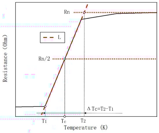 The transition of the superconducting sample’s resistance from the normal state to the superconducting state occurs over a finite temperature interval. The length of this interval is defined as the superconducting transition width, ΔTC, whose magnitude depends on factors such as material purity, crystalline integrity, and internal stress states of the sample. For superconducting thin films with a large ΔTC (≥10−3 K), the critical temperature TC is defined as the temperature at which the resistance drops to half of the normal-state resistance [].