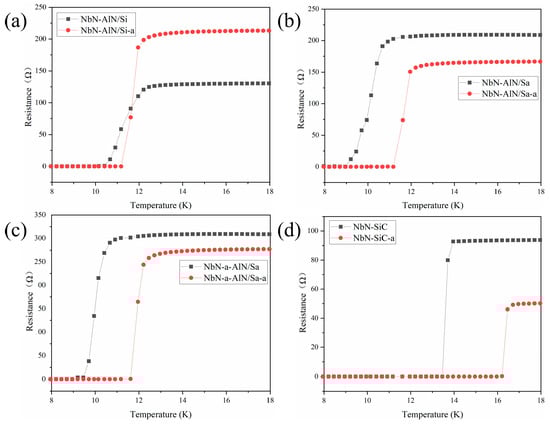 Comparison of R-T curves for four groups of NbN samples (before/after annealing) deposited on (a) AlN/Si substrates, (b) AlN/sapphire substrates, (c) Annealed-AlN/sapphire substrates, and (d) 4H-SiC substrates, measured within the temperature range of 8–18 K.