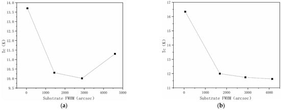 Figure 4 illustrates the correlation between the (102) plane FWHM of substrates and the TC of NbN films pre-/post-annealing. As shown in Figure 4a, the TC of as-deposited NbN films exhibits a latent dependence on substrate crystallinity, with the highest TC observed in films grown on the highest-quality substrate (4H-SiC). The non-monotonic relationship between NbN film TC and substrate FWHM implies additional influencing factors during film growth beyond substrate crystalline quality.