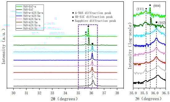 Figure 5 displays the X-ray ω-2θ scan curve of various NbN samples. All samples exhibit diffraction peaks with varying intensities near 2θ = 35.6°, whose positions closely align with the δ-NbN (111) reference peak (PDF# 00-038-1155). As no materials other than the substrate and NbN are detected, these diffraction peaks are conclusively identified as δ-NbN (111) reflections. The FWHM of δ-NbN (111) diffraction peaks, determined by profile analysis, serves as an indicator of NbN crystalline quality. These FWHM measurements are quantitatively presented in Table 4 for comprehensive comparison.