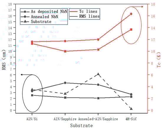 Figure 7 displays the surface RMS and TC values of substrates and NbN thin films before and after annealing. Analysis of all sample data reveals no significant correlation between thin film RMS and TC, regardless of annealing treatment. Additionally, no apparent correlation exists between thin film surface RMS and substrate surface RMS.