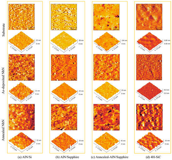(AFM) characterization of 4 substrate groups and their corresponding NbN films in pre-/post-annealing states. (a) AlN/Si substrate group, (b) AlN/sapphire substrate group, (c) Annealed-AlN/sapphire substrate group, (d) 4H-SiC substrate group.