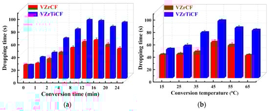 The influence of the conversion time (a) and conversion temperature (b) on the dropping time.