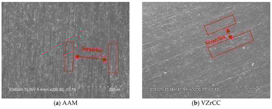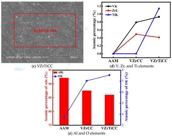 Figure 2a–c display the surface morphology of the AAM, VZrCC, and VZrTiCC, respectively. Clearly, numerous deep and wide scratches are generated on the surface of the AAM due to the sandpaper grinding during the pretreatment stage, and then the scale of these scratches changed after the CCT treatment. Despite the VZrCC surface still having some scratches, their depth is relatively shallow. Nevertheless, for the VZrTiCC surface, the number of scratches significantly decreased, and its surface was relatively flat.