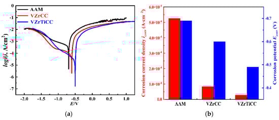 (a) Potentiodynamic polarization curves of the AAM, VZrCC, and VZrTiCC and (b) the fitting values of Ecorr and icorr.