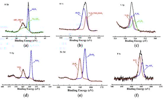 The high-resolution XPS spectra of the VZrTiCC with a CTI of 12 min: (a) Al 2p, (b) O 1s, (c) V 2p, (d) Ti 2p, (e) Zr 3d, and (f) F 1s.