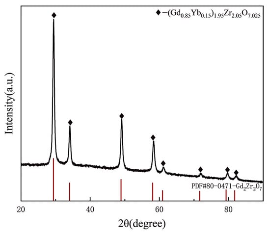 Commercial nano-sized (Gd0.85Yb0.15)1.95Zr2.05O7.025 powder (purity > 99.9%, supplied by Grirem Advanced Materials Co., Ltd., Beijing, China) was used as the raw material. XRD testing was performed on the raw material powder, and the results are shown in Figure 1. As observed in Figure 1, the XRD characteristic peaks of the raw material powder exhibit an overall rightward shift compared to those of Gd2Zr2O7. This phenomenon is attributed to the lanthanide contraction, which results in a smaller ionic radius of Yb3+ compared to Gd3+. According to Bragg’s law (nλ = 2dsin θ), a decrease in the interplanar spacing d leads to an increase in the diffraction angle θ, thereby causing the rightward shift of the characteristic peaks.