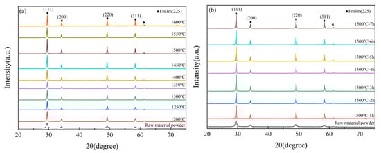 Figure 2a shows the phase structure of the targets sintered at different temperatures with a holding time of 3 h, while Figure 2b presents the phase structure of the targets sintered at 1500 °C with different holding time. As shown in Figure 2, consistent with the phase structure of powder, the phase structure of all targets is of a single fluorite phase (space group Fm3m, ICDD PDF# 00-024-1164). No phase transformations were observed during the experiments conducted at different sintering temperatures and holding times. And no peaks of the pyrochlore phase or residual oxide were detected.