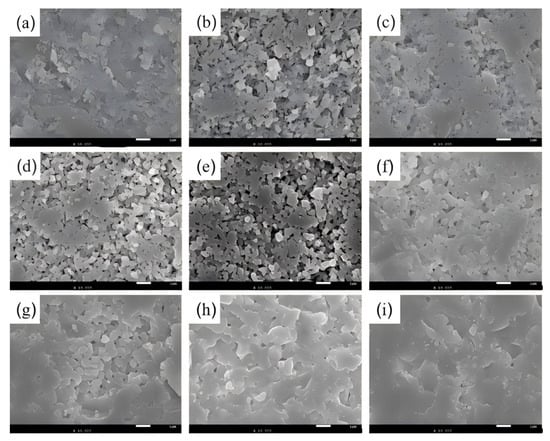 SEM of the cross section of ceramic targets under different sintering temperatures (holding time: 3 h): (a) 1200 °C; (b) 1250 °C; (c) 1300 °C; (d) 1350 °C; (e) 1400 °C; (f) 1450 °C; (g) 1500 °C; (h) 1550 °C; (i) 1600 °C.