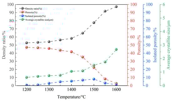 Figure 4 illustrates the effects of sintering temperature on the density ratio, average grain size, porosity, and isolated porosity of the ceramic targets.