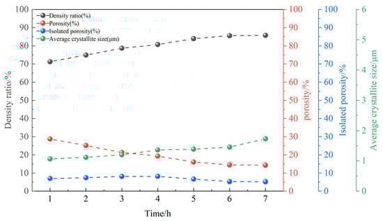 As shown in Figure 5 and Figure 6, similar to the effect of increasing sintering temperature, at 1500 °C, prolonged holding time leads to progressive coalescence of particles and growth of sintering necks, accompanied by subsequent grain growth. When the holding time reaches 7 h, the densification effect can be obviously observed. Figure 5 illustrates the effects of holding time on the density ratio, grain size, porosity, and isolated porosity of the targets.