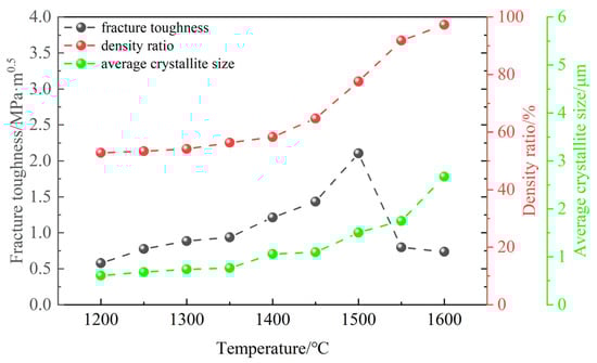 As shown in Figure 8, both the Young’s modulus and hardness increase within the temperature range of 1200–1600 °C. According to Griffith’s fracture theory, the fracture strength is proportional to E0.5 (where E is Young’s modulus), and the enhanced hardness improves crack resistance by reducing indentation crack length. The synergistic effect of these factors leads to the maximum fracture toughness at 1500 °C. However, as the temperature further increases to more than 1500 °C, significant grain growth occurs. At this stage, grain boundary energy becomes a critical factor influencing fracture toughness [31]. The reduction in grain boundary energy caused by excessive grain growth weakens the crack deflection and bridging mechanisms, resulting in a sharp decline in fracture toughness at the temperature above 1500 °C.