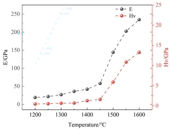 Young’s modulus (E) and hardness (Hv) of the targets under different sintering temperatures.