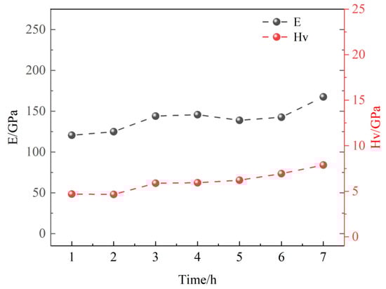 Figure 9 illustrates the relationship between density, grain size, and fracture toughness of the ceramic targets under different holding times. Figure 10 illustrates the Young’s modulus and hardness of the targets measured via nanoindentation.