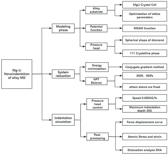 The research of Mg-Li alloys began in the 1960s. It was used by NASA for aerospace parts, but it was stalled due to high lithium prices and corrosion-resistance challenges. Nowadays, the progress of smelting and surface-treatment technology has attracted more attention. The United States, Japan, Germany, Russia and other countries have commercial series. In this study, the nanoindentation process was simulated by molecular dynamics to investigate the mechanical properties and microstructure changes of Mg-Li alloys [20,21,22]. By comparing with the actual nanoindentation experiment, this study aims to reveal the influence of different factors on the nanoindentation response and enrich the research results of Mg-Li alloys. In this study, Atomsk (V0.13.1) softwarewas used for modeling, Lammps (2023) was used for Molecular dynamics simulation, and Ovito (3.12.2) software was used for post-processing. The research procedure is as follows (Figure 1).
