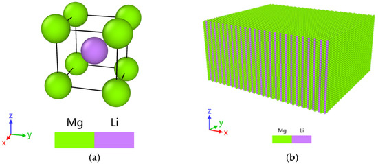 Mg-Li lattice and [111] single crystal Mg-Li molecular dynamics model. (a) Mg-Li lattice structure; (b) [111] crystal orientation model.