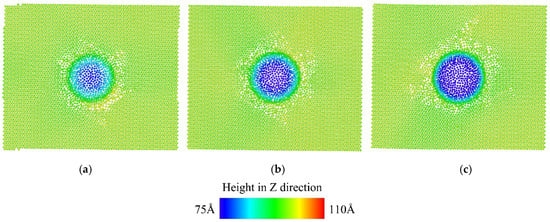 In order to observe the surface morphology of the material more intuitively, the diamond indenter atoms and other atoms except the surface in the model are deleted in the above figure, and only the Mg-Li surface atoms are retained. The color change shows the different heights of the surface atoms along the Z direction. From blue to red, the height is 75 Å to 110 Å. From analysis of the figure, it can be seen that the voids of the workpiece with [111] crystal orientation gradually increase during the loading process. With the increase in the pressing depth, the depth of the cavity gradually increases, which aggravates the interaction of atoms inside the material, and it is speculated that dislocation and slip phenomena are generated inside the material. From the diagram, it can be seen that the surface atom height around the hole is low, so it can be seen that the surface atom accumulation is less. It can be inferred that the surface force of the [111] crystal direction is small, and it is not easy to produce atom accumulation on the surface. The material is more inclined to produce dislocation, slip and deformation inside the workpiece. As shown in Figure 5b, when the pressing depth reaches 20 Å, annular bulges have initially appeared on the surface of the workpiece, which are distributed around the cavity. When the depth reaches 30 Å, the annular bulge is more obvious and has a tendency to expand outward, and the annular bulge is evenly distributed around the cavity [29]. It can be analyzed and speculated that the material tends to have atomic accumulation on the surface to eliminate internal stress, and the surface is a non-indentation area surrounded by voids. By longitudinal observation and comparison of the workpiece materials of the two crystal orientations, it can be obtained that the atomic accumulation height on the surface of the [111] crystal-orientation workpiece is significantly higher, and the annular atomic accumulation on the surface of the workpiece increases significantly with the increase in the pressure depth.