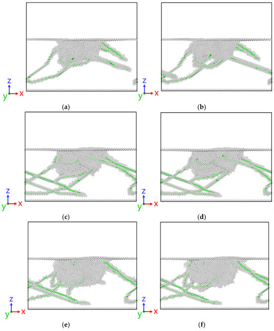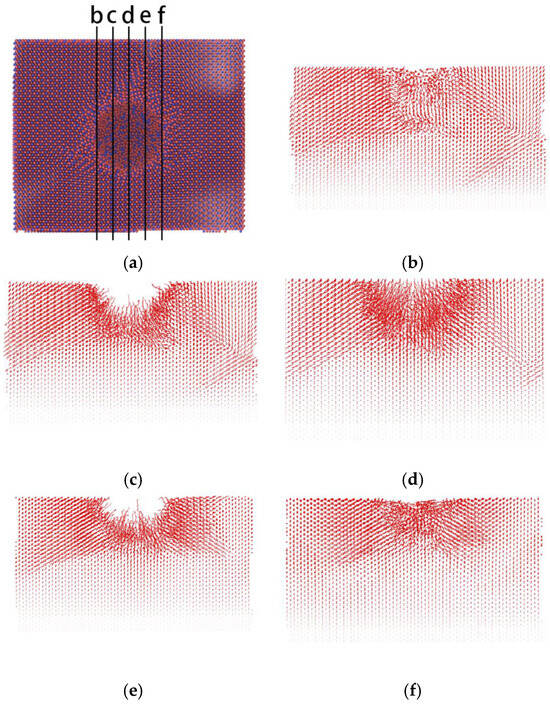 Figure 6a shows the surface morphology of the single crystal Mg-Li material with a [111] crystal orientation depth of 30 Å. For convenience of observation, the diamond indenter atoms in the figure have been deleted. In order to better study the atomic motion trajectory on the surface and inside the material, this section selects the X coordinate of the d section as 0, the X coordinate of the c section as −15 Å, the X coordinate of the b section as −30 Å, the X coordinate of the e section as 15 Å, and the X coordinate of the f section as 30 Å. Then, the atomic displacement vector analysis of the above five sections is carried out by the Generate Trajectory Lines function of OVITO. The vector in the figure represents the displacement trajectory from the initial position of the atom to the final position at the end of loading. By analyzing Figure 6d, it can be seen that when the section is located directly below the center of mass of the indenter, the trajectory of the atom covered by the indentation moves radially to the lower left, lower and lower right along the center of the upper surface of the workpiece. Other non-indentation atoms are squeezed by the indentation atoms and move along the lower left and lower right, respectively. From Figure 6c,e, it can be seen that in addition to moving to the lower left and lower right, the atoms at the indentation also have a tendency to move in a direction with a certain angle to the cross section. From Figure 6b,f, it can be seen that the atoms at the edge of the indentation receive less squeezing effect, and the atomic trajectory is the shortest and moves along the lower left and lower right. This is the same as the movement trend of the atoms in the other three sections. It can be seen that the atoms tend to move to the lower left and lower right under the external force. Comparing the five sections in the figure, since the d section is located in the middle of the indentation, the displacement vector is longer and denser, and it has a greater force and slip effect on the atoms in the non-indentation area inside the material.