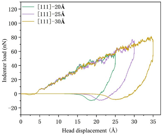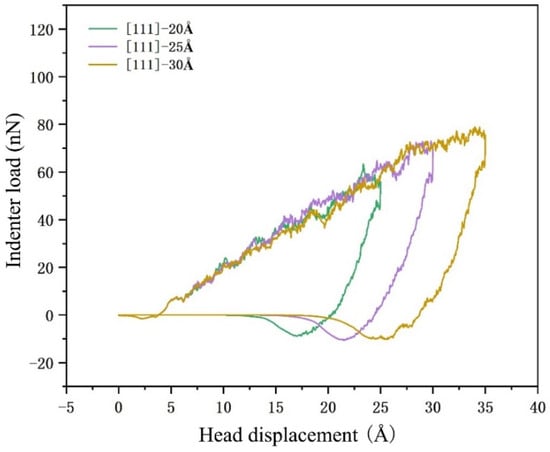 As shown in Figure 7, the color line segments in the figure represent the indenter load–displacement curves under different crystal orientations and different indentation depths. The crystal orientation and indentation depth are shown in the legend. In the indenter loading stage, with the increase in displacement, the indenter load shows a fluctuating exponential rise state, and the workpiece produces elastic deformation. This is because, in the process of elastic deformation, with the increase in displacement, the contact area between the indenter surface and the workpiece increases, and the resistance also increases. However, due to the constant loading speed, it shows a large slope upward trend. In the indenter unloading stage, due to the elastic recovery ability of the workpiece, there is still an interaction force between the workpiece and the indenter. After a short distance of displacement, the indenter load is reduced to a negative value and finally tends to 0. The indentation depth is not 0, which is due to the plastic deformation inside the workpiece and the atomic accumulation on the surface of the workpiece after the loading–unloading process. At the end of the unloading stage, the indenter load is negative, which is due to the interaction force between the lower end of the indenter and the surface atoms on the Mg-Li model under the action of the short distance force field. However, with the increase in the distance between the C atom and the Mg-Li atom, the value of this interaction force gradually decreases to 0. With the increase in the indentation depth, the residual indentation depth also increases, showing a trend consistent with the experiment, indicating that the plastic deformation in the material is more severe. The same is true for [111] crystal orientation. This is because the simulation calculation is based on the same model (two crystal orientations and two models) after energy minimization and relaxation, so it shows similar crystal structure mechanical properties. The initial curve fitting slope of the loading stage can reflect the ability of the material to resist deformation. In the later stage of the loading stage, the difference in the maximum indenter load reflects the ability of the material to resist the load.