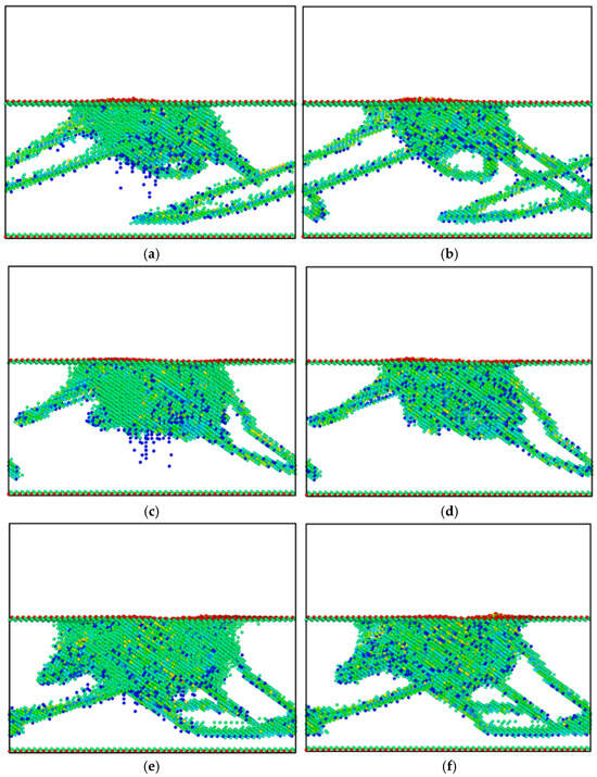 In order to further study the surface accumulation and the internal atomic motion trajectory, the following content studies the atomic displacement vector during the nanoindentation process, as shown in Figure 6.