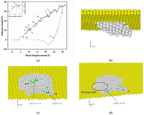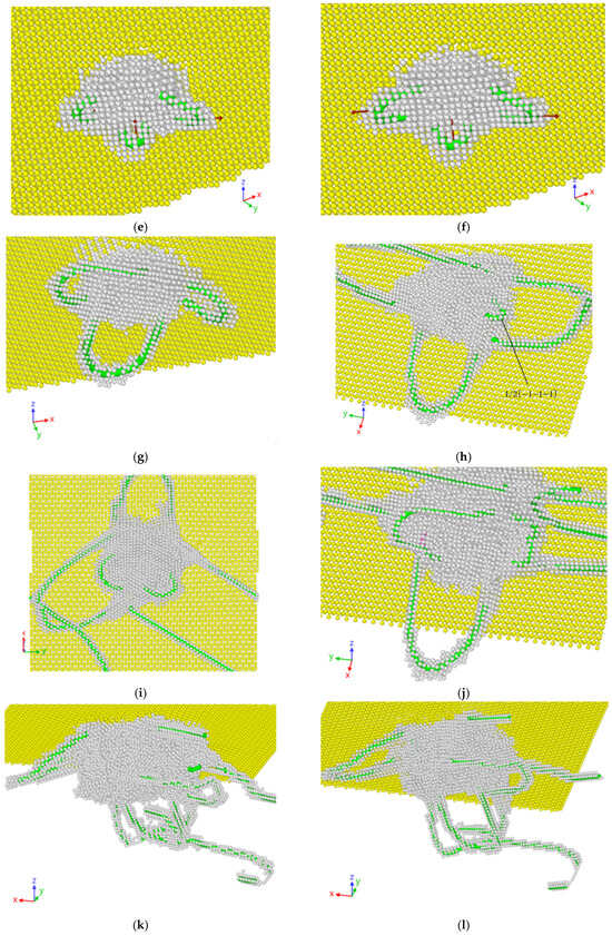 The cloud diagram shown in Figure 10 is the model stress-analysis diagram of each sampling point, Figure 10a–k, which corresponds to points b to l in the ballast–displacement curve in turn, a total of ten points and ten diagrams. Figure 10 shows the stress cloud diagram of the middle slice of the y-axis of the model. The diamond spherical indenter is retained in the figure to facilitate the intuitive observation of the indenter displacement. The color area is the stress distribution. It can be seen from Figure 10a that in the early stage of the pressing process, stress was generated in the area directly below the diamond indenter. In Figure 10b, the stress expands along the horizontal direction, so that the larger area below the indenter begins to undergo dislocation reaction under the influence of stress, resulting in full dislocations with Burgers vectors of 1/2 [−1−1−1] and 1/2 [11−1]. The generation of full dislocations effectively alleviates the expansion of stress. Comparing Figure 10c–e, due to the increase in displacement, the color of the stress area is deepened and the range is expanded. The area other than the projection of the indenter on the material is also affected by the stress. The color changes from dark blue to blue, and the shape of the stress area is ‘inverted T’. In Figure 10f, when the displacement of the indenter is 14.6 Å, a high-stress area appears under the indenter, which is shown as red and yellow areas in the stress cloud diagram. The ‘inverted T’-shaped stress region changes to a rectangular region. The bottom of the stress area begins to expand to the bottom of the model. A stress ring is also generated around the stress region, and the corresponding defect analysis is dislocation emission. The stress ring in Figure 10g expands to the left and right sides, respectively, and the dislocation emission length increases, which relieves the internal stress and relieves the stress to a certain extent. The high-stress area shrinks, and the corresponding ballast–displacement curve decreases. In Figure 10h, the high-stress region continues to shrink, the area of the medium-stress region increases and expands to the left, the stress ring continues to expand to the left and the length of the dislocation ring continues to increase. In Figure 10i, a high-stress area appears in the area directly below the indenter, which is due to the generation and interleaving of multiple dislocations hindering the release of stress. In the load–displacement curve, it shows a sudden increase. Figure 10j shows that when the indenter displacement reaches a maximum of 30 Å, almost half of the diamond indenter is submerged into the material, and the high-stress area directly below the diamond indenter continues to expand into an inverted triangle. The stress reaches a maximum of 4.6 GPa, and the green medium-stress area presents an ‘inverted T’-shaped cylinder at the projection position of the indenter. As shown in Figure 10k, when the indenter unloads the distance of 5 Å, the high stress and medium stress in the original area dissipate. Due to the elastic deformation characteristics of the material, the existence of dislocations and defects makes it retain some residual stress.