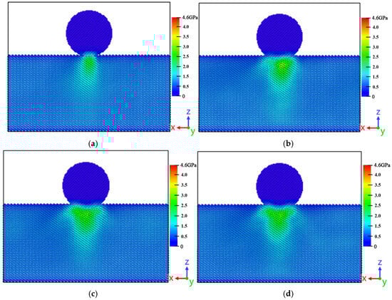 In order to explore the stress change inside the material and its influence mechanism on the defect structure, this section analyzes the von Mises equivalent stress of the molecular dynamics nanoindentation process of the Mg-Li material [111] crystal-orientation model.