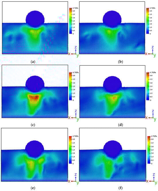 [111] cloud diagram of equivalent stress change before and after stress relaxation under different pressing depths in crystal orientation; (a) 20 before stress relaxation; (b) 20 after stress relaxation; (c) 25 before stress relaxation; (d) 20 after stress relaxation; (e) 30 before stress relaxation; (f) 30 after stress relaxation.