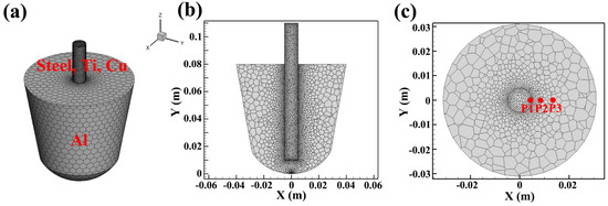 The temperature field and process of solidification at the interface were simulated by FLUENT software (2021 R1 version). In the model, the high-melting-point metals were treated as the solid region, while the molten aluminum was modeled as the fluid region. A non-uniform polyhedral mesh was used, which included about 90,000 grid elements (Figure 3a). To ensure calculation accuracy and save calculation time, the grid away from the Al/Steel interface was coarsened properly. In Figure 3b,c, comparative analyses were performed at three locations: at the interface (P1), 3 mm away from the interface (P2), and 6 mm away from the interface (P3). The model simultaneously solves conservation equations of mass, momentum, and energy to simulate the hot-dipping process. When the interfacial temperature of dissimilar metals is between the solidus and liquidus of aluminum, the grid is in a solid–liquid mushy region. The enthalpy–porosity method is employed to address the momentum change in the solidification. The initial temperatures of molten aluminum were established at 943 K, and the temperature of high-melting-point alloys was set at 300 K.