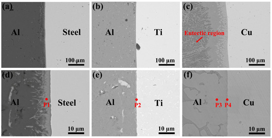 The SEM morphology of the interface with different magnification: (a,d) Al/Steel; (b,e) Al/Ti; (c,f) Al/Cu.