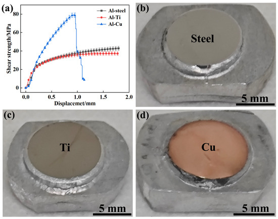 The shear test results of the joints are presented in Figure 7. Significant variations were observed in both shear strength and displacement among the three different joints. The Al/Cu joint exhibited the maximum shear strength of 79.12 MPa, followed by a sudden strength reduction after reaching the peak value, indicating a predominantly brittle fracture mode. This fracture behavior suggests that the weakest region of the joint is located at the interfacial IMCs rather than the solidified aluminum layer. The diffusion of substantial copper atoms into the aluminum layer near the interfacial IMCs leads to the formation of solid solutions and strengthening phases. This phenomenon enhances joint strength through two dominant mechanisms: solid solution strengthening, where dissolved Cu atoms in the Al matrix distort the crystal lattice and effectively impede dislocation motion; a precipitation strengthening through the formation of intermetallic phases within the solidified Al layer [36].