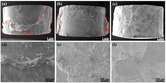 Fracture behavior of shear specimens: (a,d) fracture morphology of Al/steel; (b,e) fracture morphology of Al/Ti; (c,f) fracture morphology of Al/Cu.